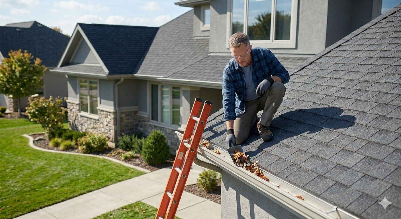 esidential medium shot capturing a man actively standing on and supported by an extension ladder while scooping debris from a gutter, used to illustrate effective and safe exterior home maintenance.